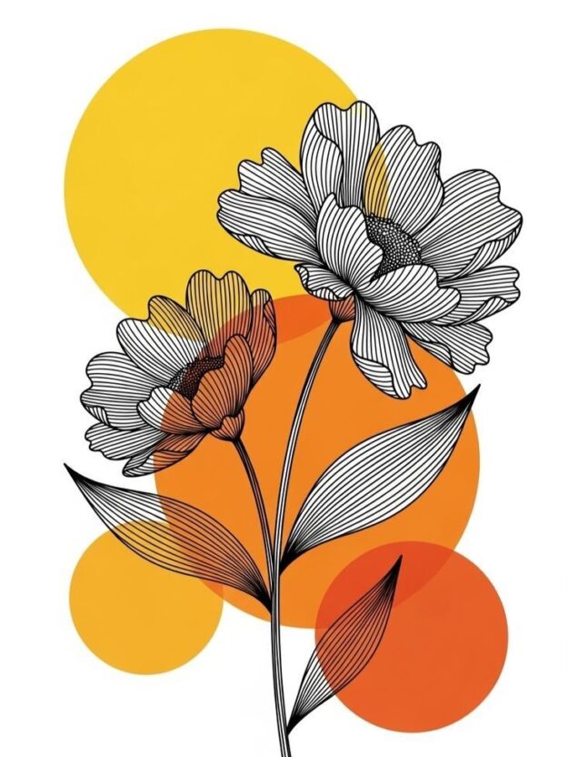 Aapke Space ko De Ek Naya Look: Apne boring walls ko is stunning Modern Botanical Line Art ke saath transform karein. Ye painting ek sophisticated mix hai traditional floral sketching aur trendy mid-century modern shapes ka. Isme do khile huye phoolon ko bariki se black lines mein darshaya gaya hai, jo bright sunset colors ke circles ke upar set hain.